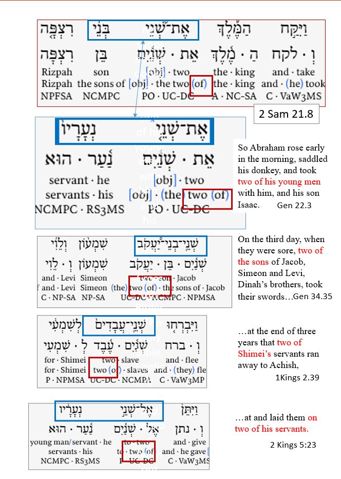 7.       Although not legitimate heirs to the throne, there were at least two other sons of Saul in the same age range as the others, by one concubine (which shows up in this 2nd Samuel story). It would be unusual for a king to have had only one concubine at the time, so there might have been other sons as well. And depending on the date of their connection, Rizpah could have had other unlisted sons by Saul as well (the Hebrew construction could easily be translated as ‘two OF her sons which she bore to Saul’—see figure below—there is no ‘the’ in the phrase ‘the two sons’), before bearing children for her post-Saul husband. [All of the sons of Saul—including Rizpah’s two-- would have been expected to participate in military initiatives (including those against Gibeon) along with the ‘official’ sons.]