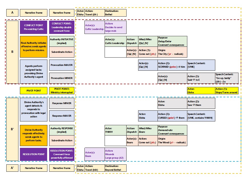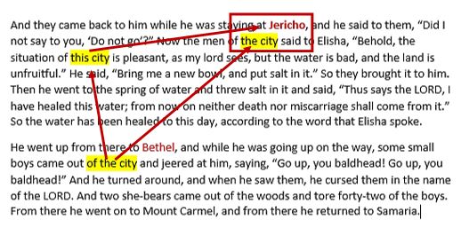 This would allow the mob to come out of the city AFTER Elisha had traversed and emerged from the city, and was on the third segment of the trip (Bethel to Carmel. This makes much better sense of the looking behind, but would require: (1) the go up taunt to refer to something OTHER THAN the incline that Elisha would still have ahead of him, if he were still on the first segment; and (2) require the change of locomotion word from ilh (segment 1) to hlk (segment 2) to be of no consequence. [Biblical writers rarely do that! they layer nuance upon nuance, in the most intriguing and powerful ways.]