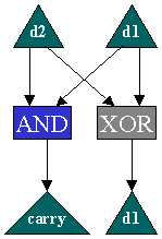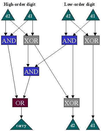 A two-bit, binary adder circuit (see diagram below) can be built from 7 logic gates (3 XORs, 3 ANDS, and 1 OR). But the logic gates have to be placed in a certain arrangement and in some cases, in a certain sequence. If I place the wrong type of logic gate where another should be (e.g., replacing the OR gate with an AND gate for the last step of determining the carry digit), the adder doesn't not function correctly. Likewise, if I route the wrong input to a gate (e.g., low-order digit, d1 into the AND gate for the high-order digit), the adder fails.